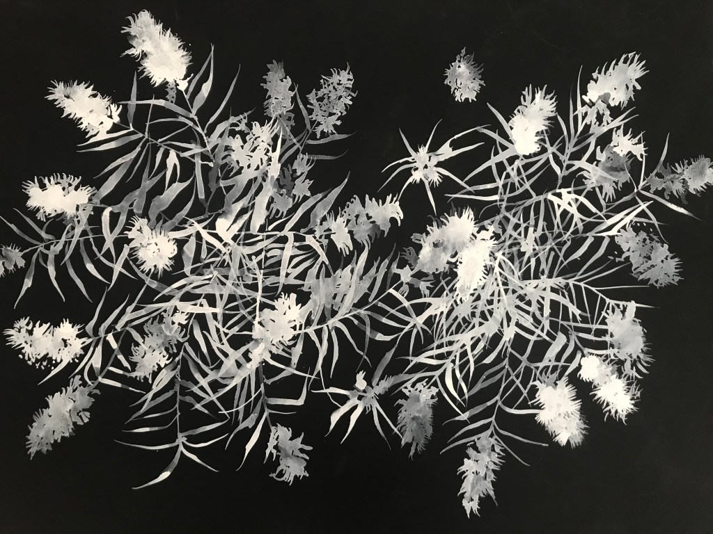 The making of this drawing preceded the recent bushfires, but the signs were already clear that native wildlife and vegetation were under threat from escalating environmental catastrophe. I wanted to express my appreciation of the beauty and delicacy of the melaleuca in flower, while the blackness of the background portends trouble.