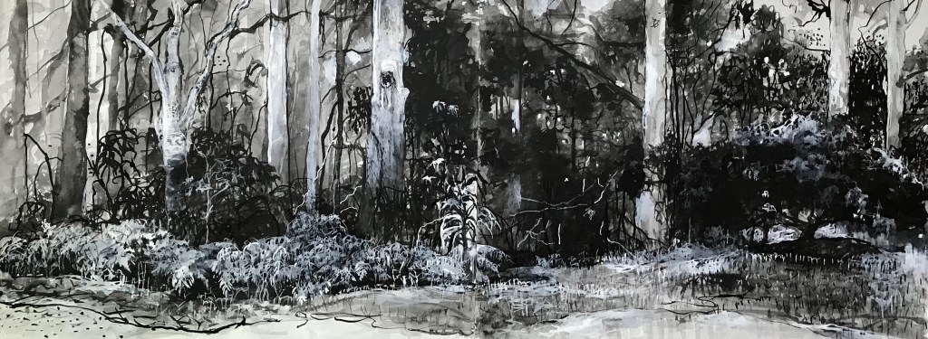 One year ago I moved to live on the Sunshine Coast hinterland where I am surrounded by forest. This rich, leafy landscape is dense and complex, endlessly varied and lush. It sometimes seems quiet, but if you listen, it pulses and breathes, sighs, cracks, rustles, chirrups and screeches. This drawing was completed en plein air. I placed my prepared card flat on the ground in a clearing and using a long extension on my brush, drew what I could see, hear and feel in front of and around me.